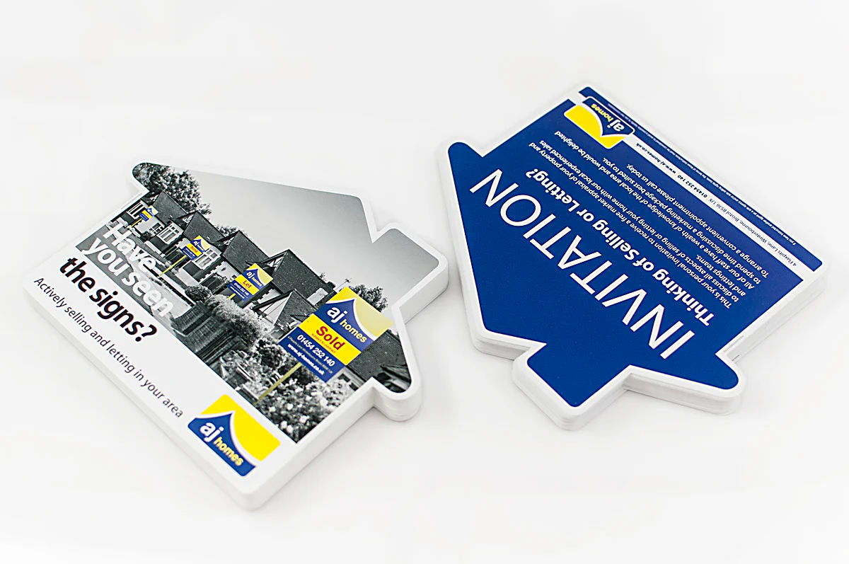 Custom-shaped die-cut flyers printed on premium cardstock, designed to make your brand stand out with unique shapes and finishes.